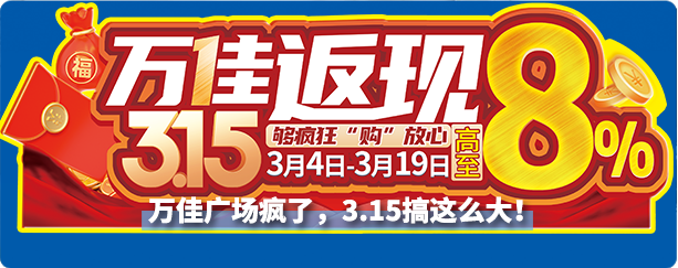 视频详情 开业福利不断,优惠还在继续,万佳广场3.15,返现高至8%活动也仅剩1天,3月19日下午18:00还抽万元大奖,还没有购买家居建材的顾客朋友们,抓紧时间来抢购吧!