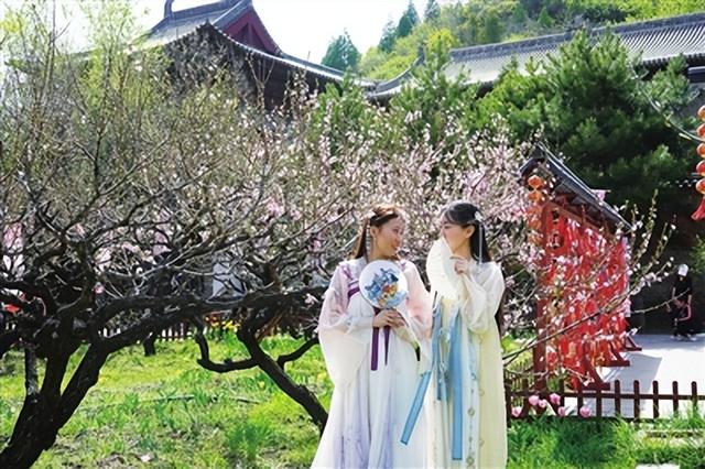 不少游人兴致勃勃地身着汉服,在桃花园内赏花游玩步入山间,树木成荫、鸟声啾啾、溪水潺潺,正是一番好春光伴着悠扬古乐,身着汉服的女孩子或细步于长廊石阶回眸一笑,或轻倚在栏杆眺望远处,随手一拍尽显古风古韵此情此景,使游客感到似乎“穿越”回古代,近距离触摸中华传统文化。