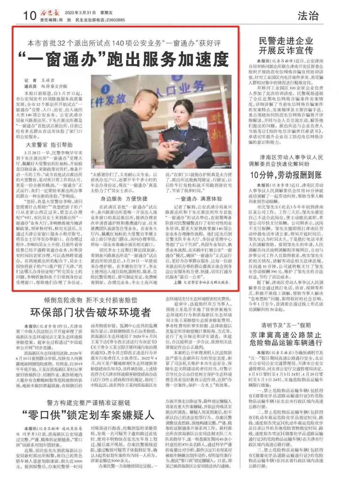 本报日前报道,自3月27日起,市公安局发布22项措施服务高质量发展,全市32个派出所开始试点“一窗通办”交管、人口、治安、出入境四大类140项公安业务公安武清分局泉兴路派出所、下朱庄派出所都是“一窗通办”首批试点派出所,目前已经有多名群众在这里体验了家门口的公安服务。