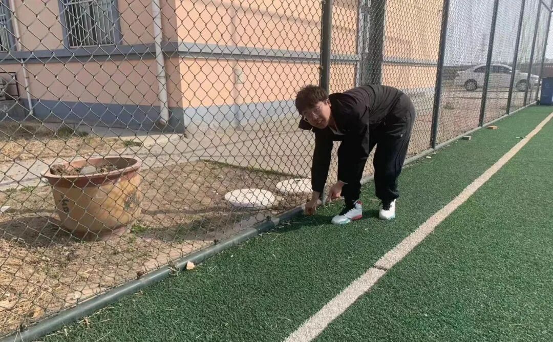 的安全保障。随后,大家纷纷手拎垃圾袋,弯腰捡拾足球场上的烟头、废纸、塑料瓶等杂物,使足球场呈现一片崭新的绿色。