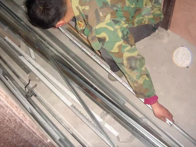 ▲安装时要时时关注龙骨间的间距,并做出调整。间距刚好是吊顶的宽度30cm。