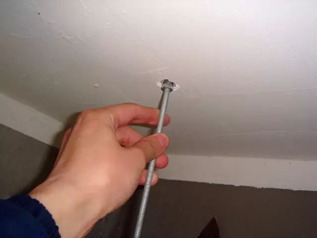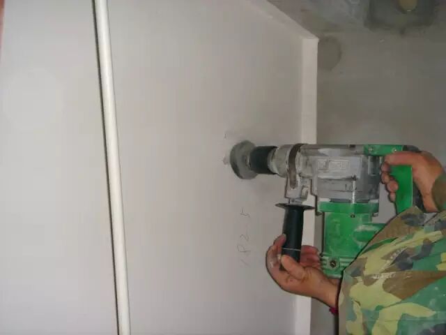 ▲用电钻打孔,然后将吊线打入孔中。孔深在3cm左右,以确保吊线的牢固。