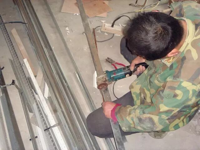 ▲用电锯裁切出适合房间长度的轻钢材料。