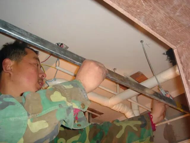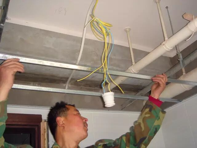 ▲由于墙壁阻挡,不方便固定吊顶接口,工人要从多个方面对吊顶进行固定。