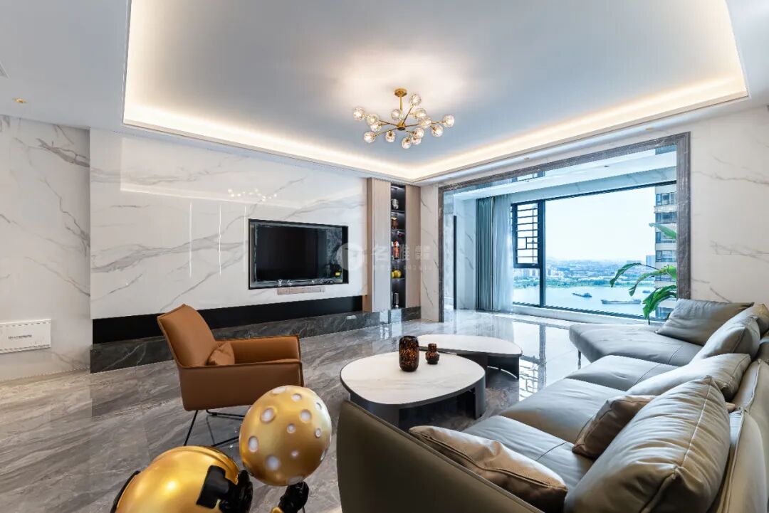 本案玄关入户方式新颖,以寻常视角中的封闭式阳台作为入户的第一空间,正因如此,天碧云白、江河阔朗得以成为归家生活的主旋律,永远爽朗动人。