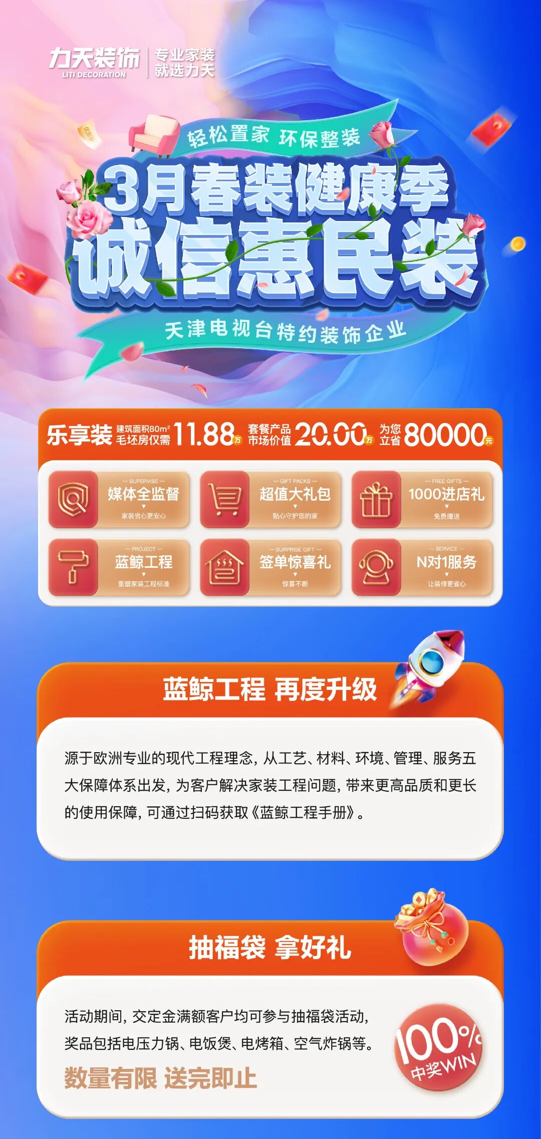 草长莺飞季,家装正当时在这个春风和煦的阳春三月力天装饰携手天津电视台打造「3月春装健康季 诚信惠民装」活动为广大业主谋得装修超值福利