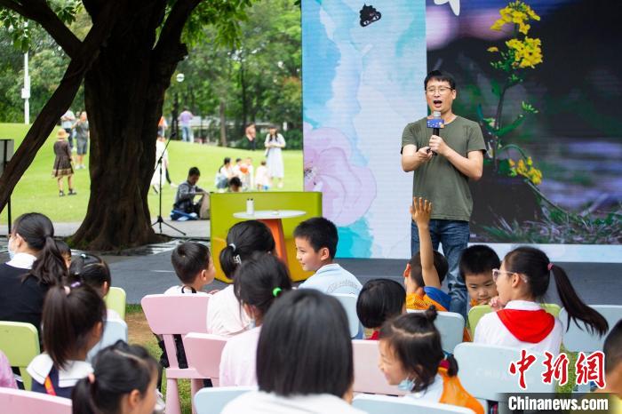 活动现场 朱英豪 摄 中新网广州4月17日电 题:儿童文学作家陈诗哥:张开童话的眼睛看世界 作者 程景伟 朱英豪 “在宇宙的另一边,加法是这样的:大地万物加上一场大雪等于一片白茫茫……”在广州市儿童公园内,南草坪榕树下的阅读空间传来天真清脆的儿童诗朗诵之声,让公园更添诗意童趣。