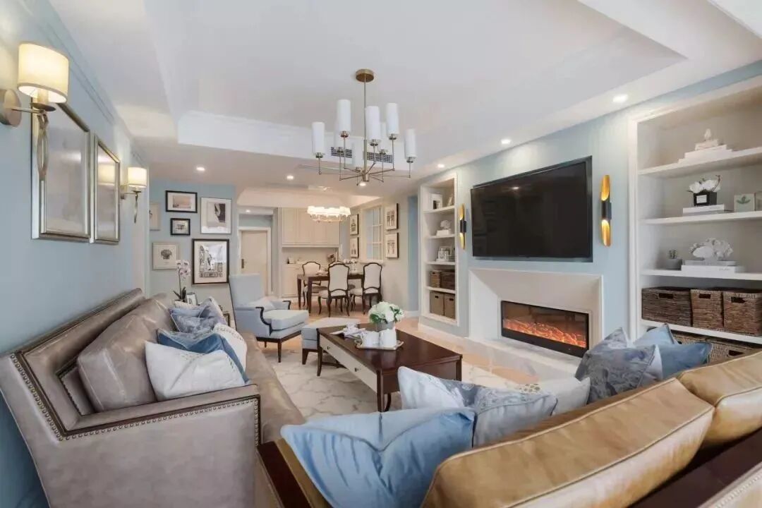 二、客厅客厅的电视墙,如果可以的话,通过造型与收纳结合,装上一整面墙的收纳展示柜,整个效果也是非常的实用大方。