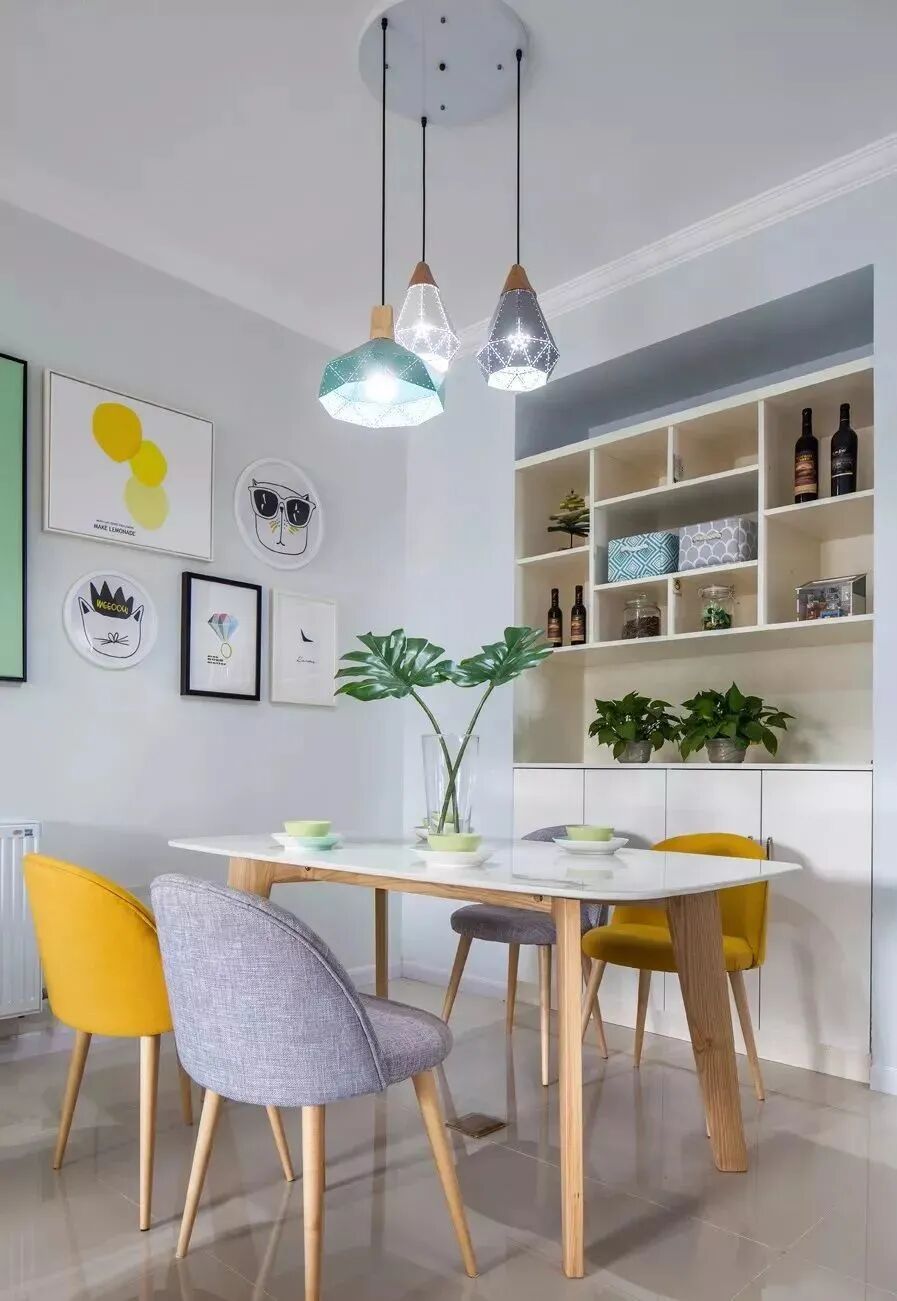 三、餐厅一些比较紧凑的户型里,餐边柜如果直接摆放的话,那么餐厅的布局就会显得很局促,这个时候开发一下餐厅旁边的墙体空间,装个入墙式的餐边收纳柜,把空间利用到位,同时又能保持活动区的宽松舒适。