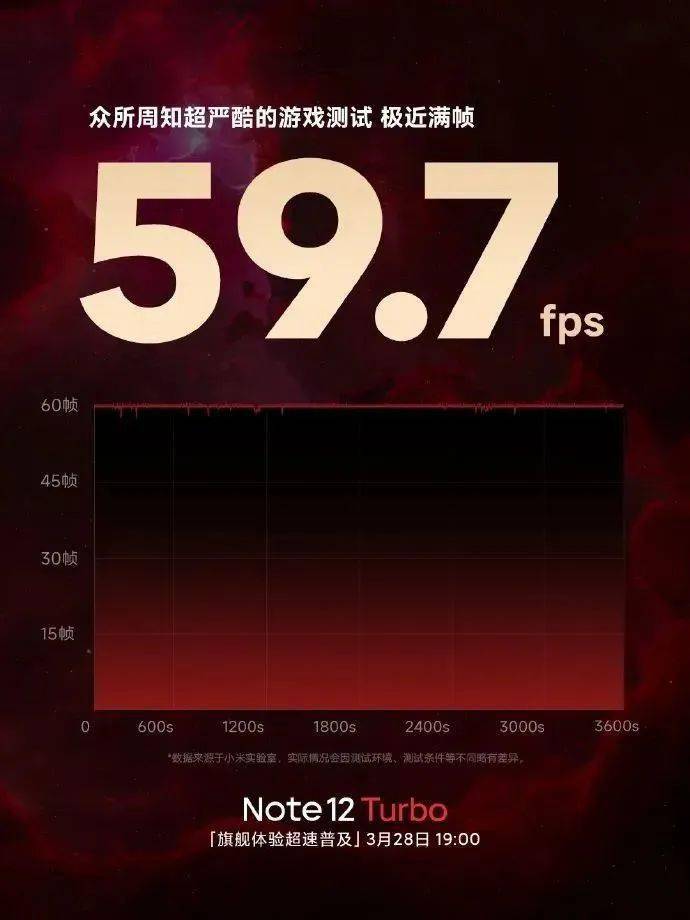 此外,官方还公布了Redmi Note 12 Turbo的性能测试成绩,宣称在众所周知超严酷的大型RPG游戏测试中,该机的实测达到了59.7fps,几乎接近满帧。