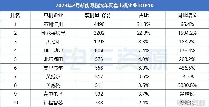 据电车资源数据显示,2023年2月,新能源物流车销售近1.44万辆,相应的电机配套也同比增长94.4%目前,在新能源物流车领域,主要电机供应商有苏州汇川、卧龙采埃孚、大地和、理工动力等与1月相比,2月电机配套TOP10企业有新面孔——英威腾以同比超38倍的增幅进榜,菱电电控则是净增长。