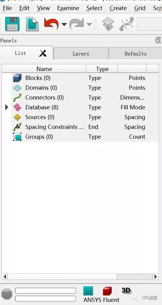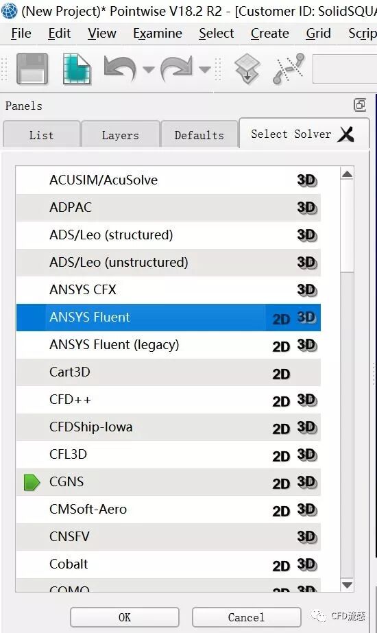 然后在顶部工具条CAE->select solver-> Ansys fluent->OK, 这时在窗口的左下角就会显示出求解器是ANSYS FLUENT。