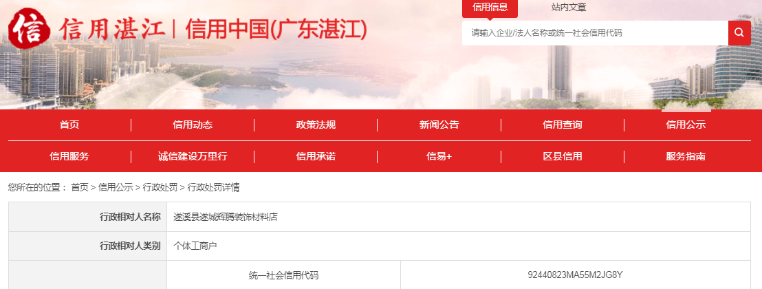 中国质量新闻网讯 近日,信用中国(广东湛江)网站发布一条处罚信息,涉及遂溪县遂城辉腾装饰材料店,该店销售侵犯注册商标专用权的商品被处罚具体信息如下:行政相对人名称遂溪县遂城辉腾装饰材料店行政相对人类别个体工商户