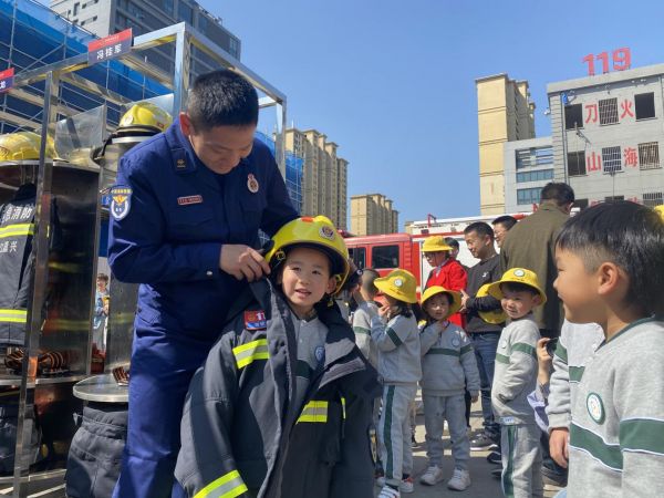 孩子们认真列队聆听消防员讲解消防车的用途、消防员的接警处置程序,以及如何在日常生活中做好防火防灾,还一一穿戴起消防服和防护面具,小手都拽得紧紧的,仿佛自己正亲历着“火灾救援”任务半天的体验活动,使幼儿加深了对消防员的职业了解,产生职业敬畏感。