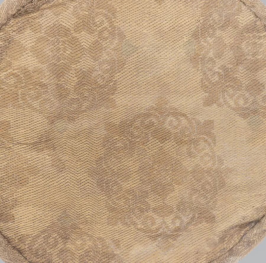黄地小宝花纹锦为Z向三枚斜纹纬二重组织,局部斜向有变黄色为地,浅褐色为花此图案的宝花排列较为少见,只有一种纹样单元进行二二错排,宝花直径约为6厘米,图案循环约经向9厘米,纬向7厘米另一件深紫地花瓣纹锦其实为某宝花纹锦的局部,但无法测得图案循环。