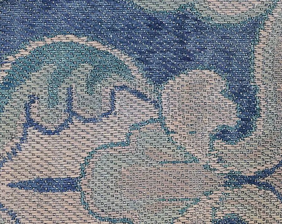 图案经向循环17厘米,纬向循环13厘米,底部有黄、褐、黄、绿的纬线色带,应该是分隔图案区域的色区(图10)