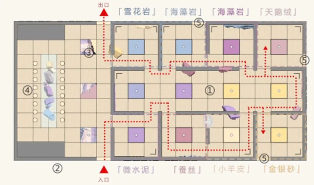 △展厅动线规划图 # 色彩立体感运用 # 为传递立邦魔术漆“取质自然”的理念、展现“奇境”的主题氛围,设计师从巴哈马的粉色沙滩汲取了色彩灵感,将日出时天空的橙黄色和海面的烟粉色,注入到这个春日迷宫里,让整个空间“活”了起来。