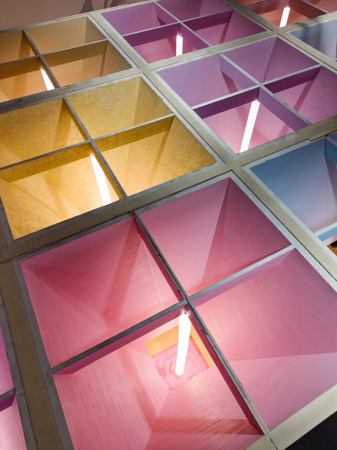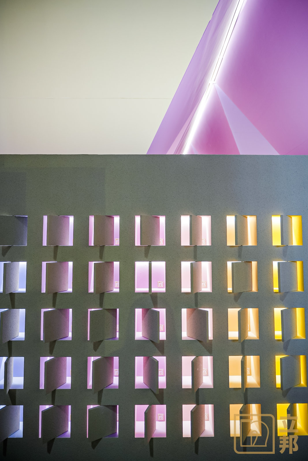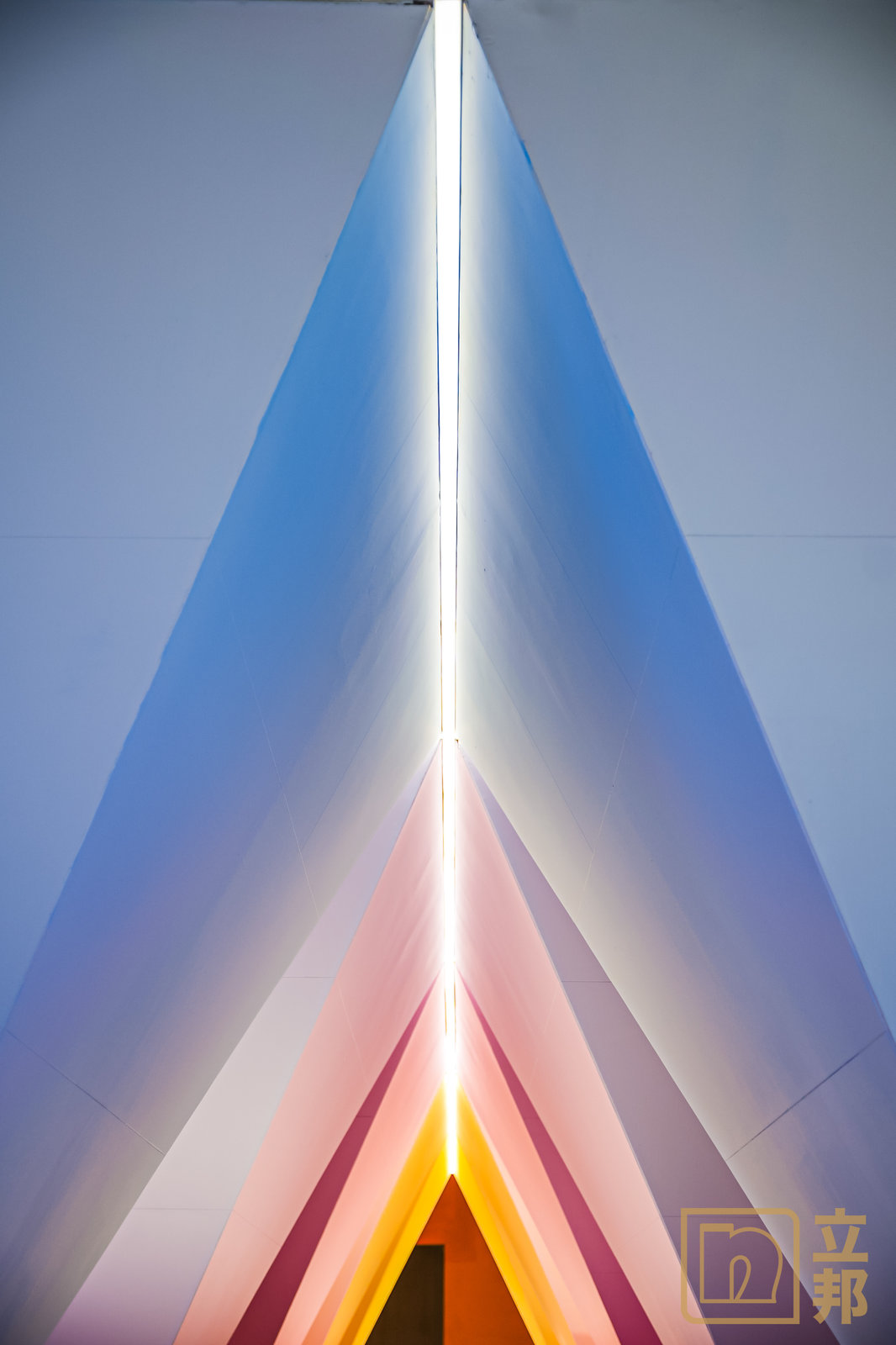 △展厅光影变化效果图不同色块立斗由互动的呼吸光柱连接对应的方形矩阵空间,形成独立主题的方阵。斜面的空间布局又如同三棱镜一般,光影的流动折射赋予空间无限神奇的变化。