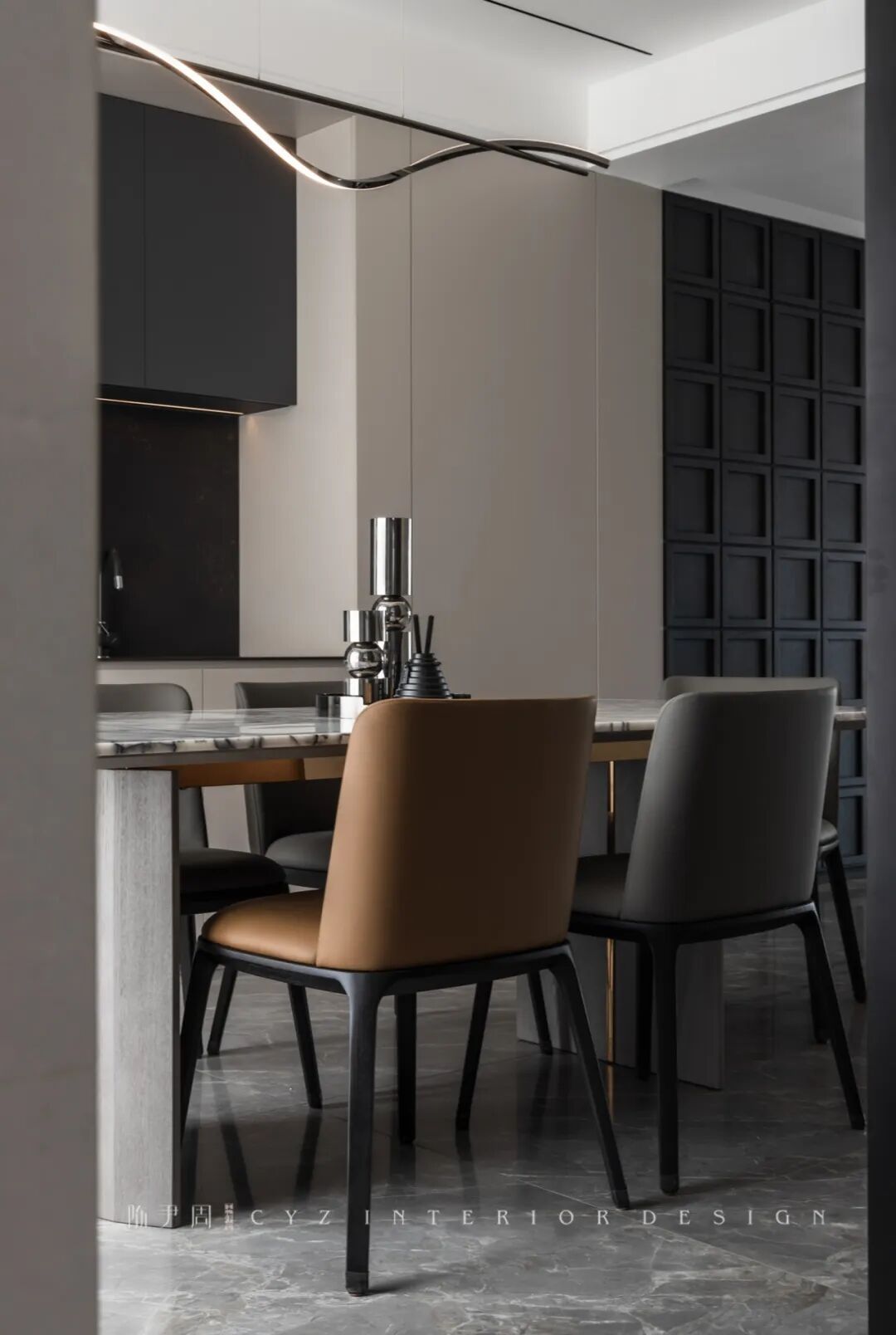 餐厅在美观和实用性方面达到了完美的平衡。深灰和橙色双拼餐椅透着现代都市的运动活力,大花纹奢石餐桌富有质感,绮丽的曲线吊灯让餐厅多出了一些轻盈的质感。