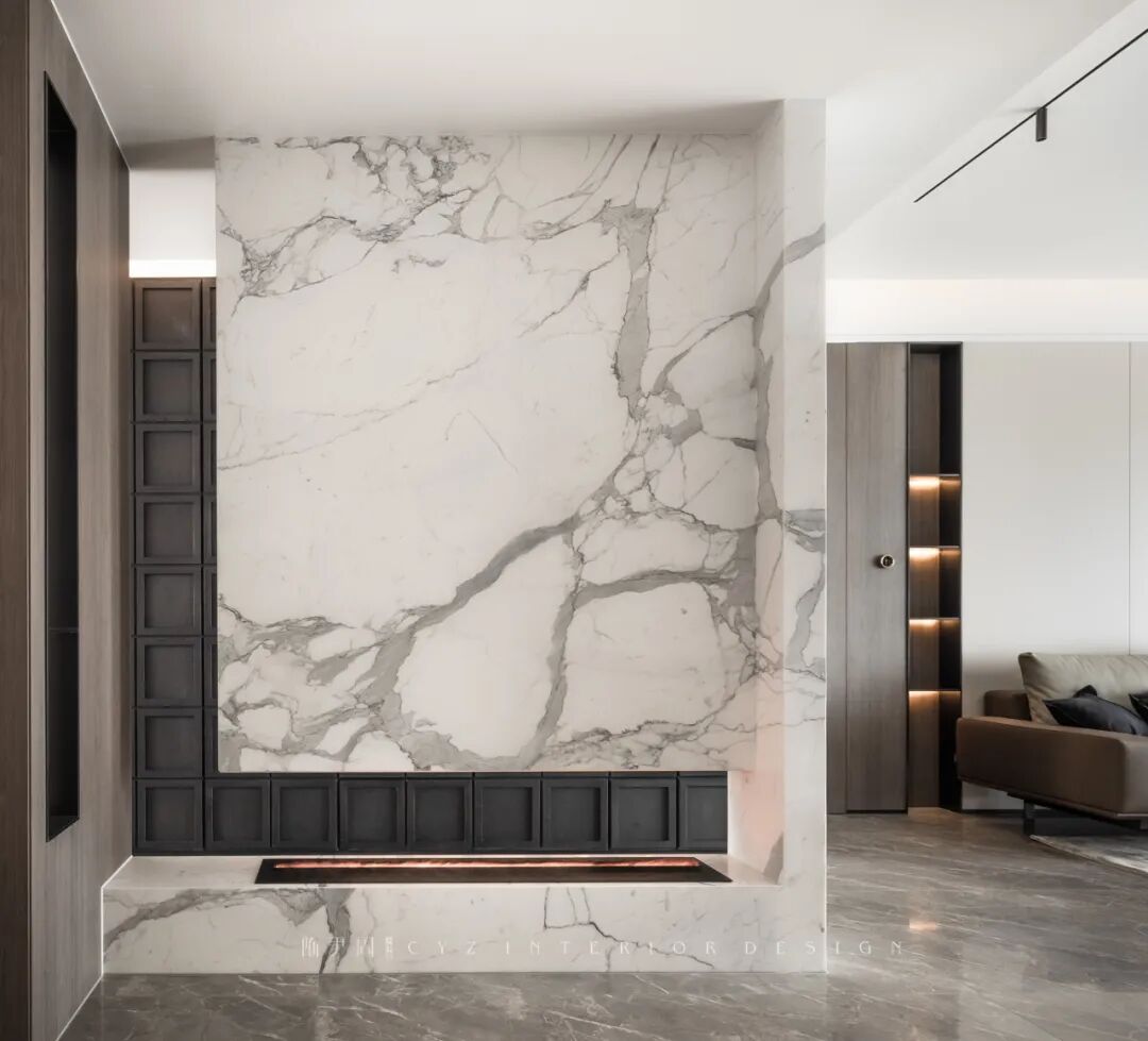 走进玄关,鱼肚白石材和深色镂空方格组成的“L”造型映入眼帘,它是屋主姓氏的首字母,家的符号标志。位于底部的火焰特效由空气加湿器改造,雀跃的火光给人温暖的视觉冲击。