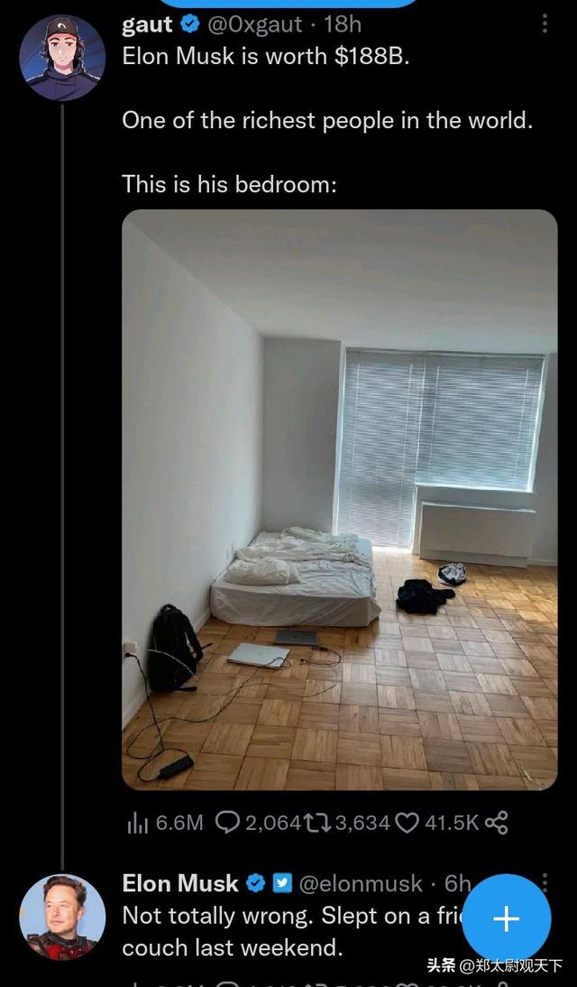 近日,有人在网上贴出了世界首富马斯克的卧室贴照片的人说,马斯克资产1880亿美元,这就是他的卧室上面可以看到只有一张床垫,连床都没有地板上放着一些衣服、一个背包和两个笔记本电脑而且马斯克还回复了这张图,说:“和真实情况差不多,实际上上周我是在朋友家的沙发上睡的。