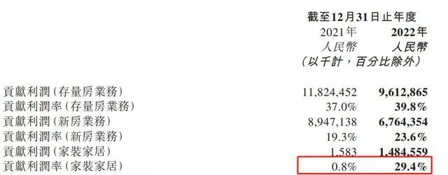贝壳财报显示,家装家居的贡献利润率在去年达到29.4%,而2021年为0.8%。