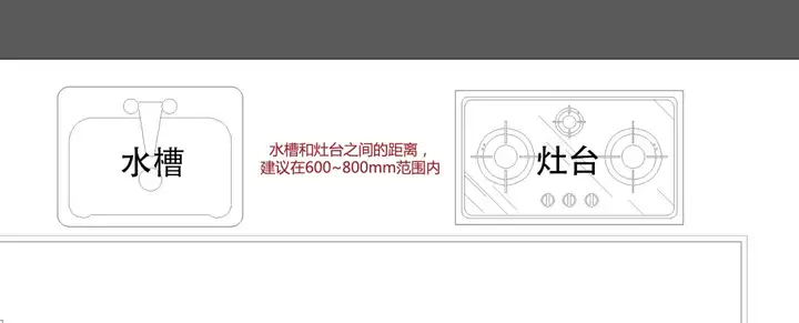 2. 让准备区“来得及准备” 在水槽和灶台之间,一般会留一定的空余准备间,用来放案板切菜、和面等这部分区域的长度,如果小于300mm,那么只能放个盘子,基本没有切菜的空间建议设计之初,将长度控制在600-800mm,足够放下案板的同时,也不至于因相距太远而显得整个橱柜台面失调。