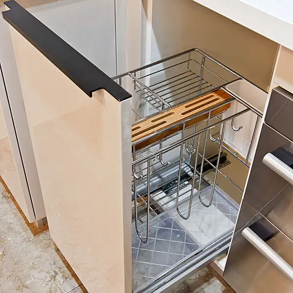 (2)在橱柜底柜设置拉篮:平时可以将砧板、大油壶、调味瓶、储物罐等烹饪所用的物品放进去,还可以一边看着锅一边顺手拿起自己需要的调料罐,顺手很多。