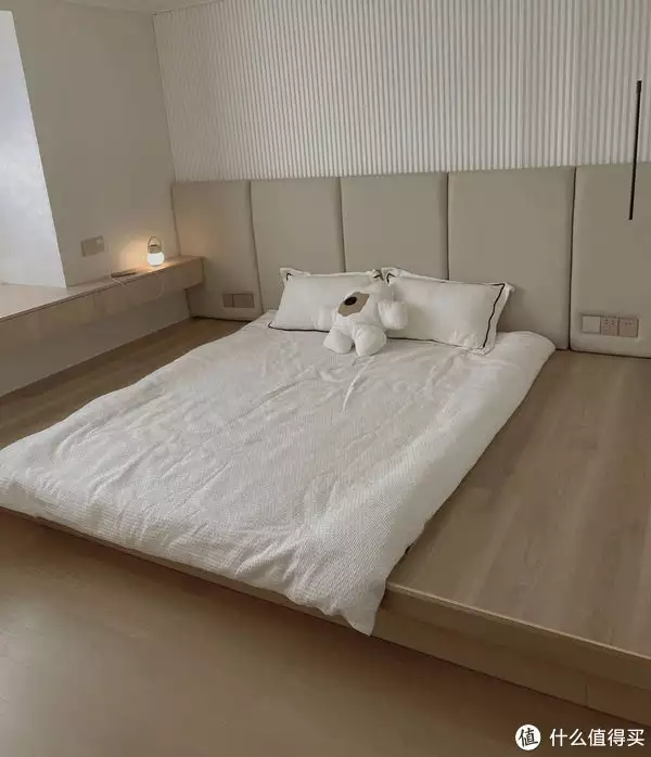 如果施工过程不到位,灯槽和顶面腻子接触的地方,还会开裂起皮,踩坑的风险很大。6、地台床在卧室地面起个台子,放张垫子,就是地台床了,优点是够大,旁边可以随意增加床垫,多人入睡,有点像大通铺。