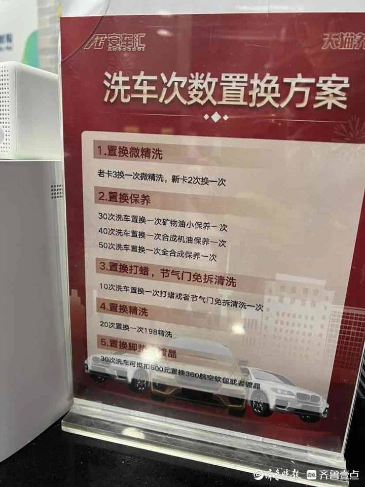 记者来到安车汇,在收银台摆着一个牌子,写着“洗车次数置换方案”,一共五项内容“目前本店只能置换不接受退卡,从第一次换新卡开始算,有效期一年”工作人员说而壹粉符合要求的只有一项只有“老卡3换1次微精洗,10次洗车置换一次打蜡或者节气门免拆清洗一次,及20次置换一次198精洗。