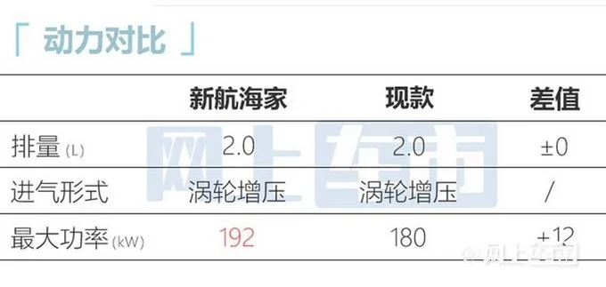全新一代航海家搭载型号为CAF484WQC4的全新2.0T发动机,最高车速200km/h,最大功率由现款180kW提升至192kW,较同级别的宝马X3、奔驰GLC更强;混动版搭载2.0T发动机+电机,并配备比亚迪生产的镍钴锰酸锂蓄电池。