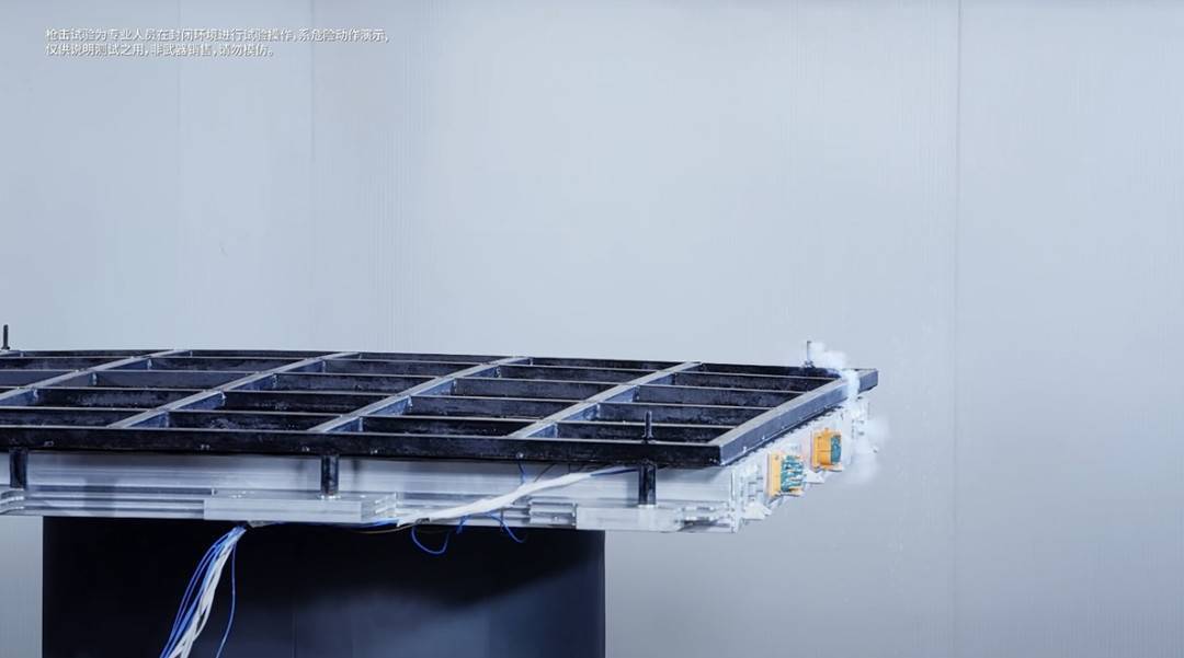 埃安此次弹匣电池2.0枪击试验是迄今极为严苛的电池安全试验,在15米处对预留射击开口的满电电池整包进行射击,当子弹穿透电芯时,速度可达针刺的97.5万倍,创口直径是针刺的7-8倍,可瞬间击穿多个电芯并造成热失控和爆裂性破坏。
