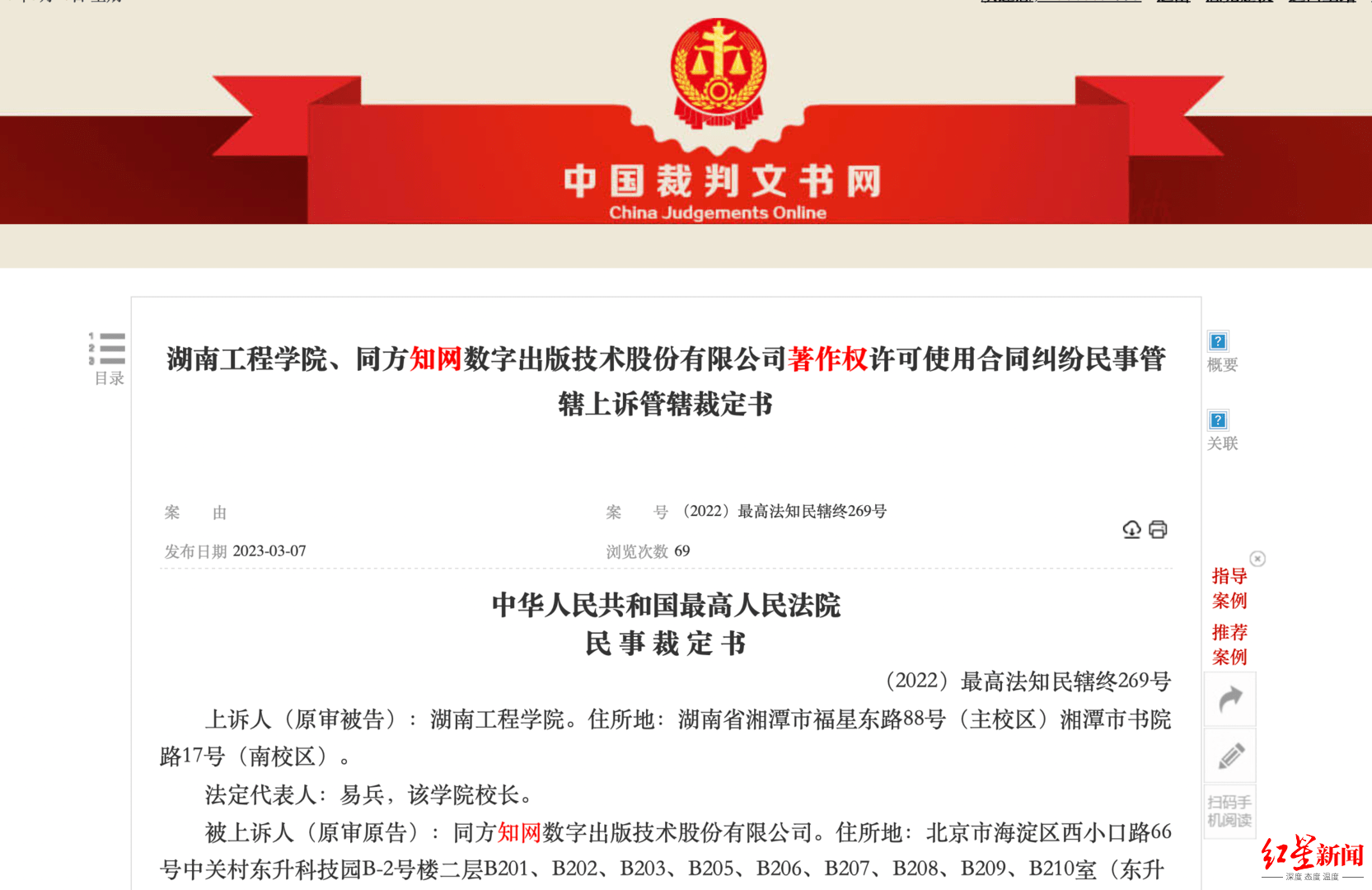 以中国裁判文书网3月7日公布的一份最高人民法院民事裁定书为例2021年,知网以软件著作权许可使用合同纠纷向法院提起诉讼称,2020年4月8日,知网与湖南工程学院签订涉案合同,后知网如约发送相关账号,开通相应权限,湖南工程学院也如约支付了合同款。
