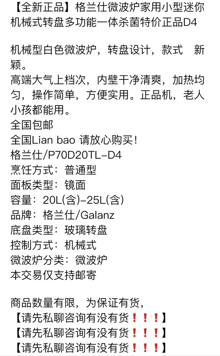 所以不建议跟这类职业卖家交易,去1688找同款更有保障像我一开始直接搜“微波炉”,出现了很多“全新”成色,且价格低得让人迷惑的商品其实这也是商家的套路,要不让你加微信加群,要不让你复制链接去淘宝,要不就是别人退的货。