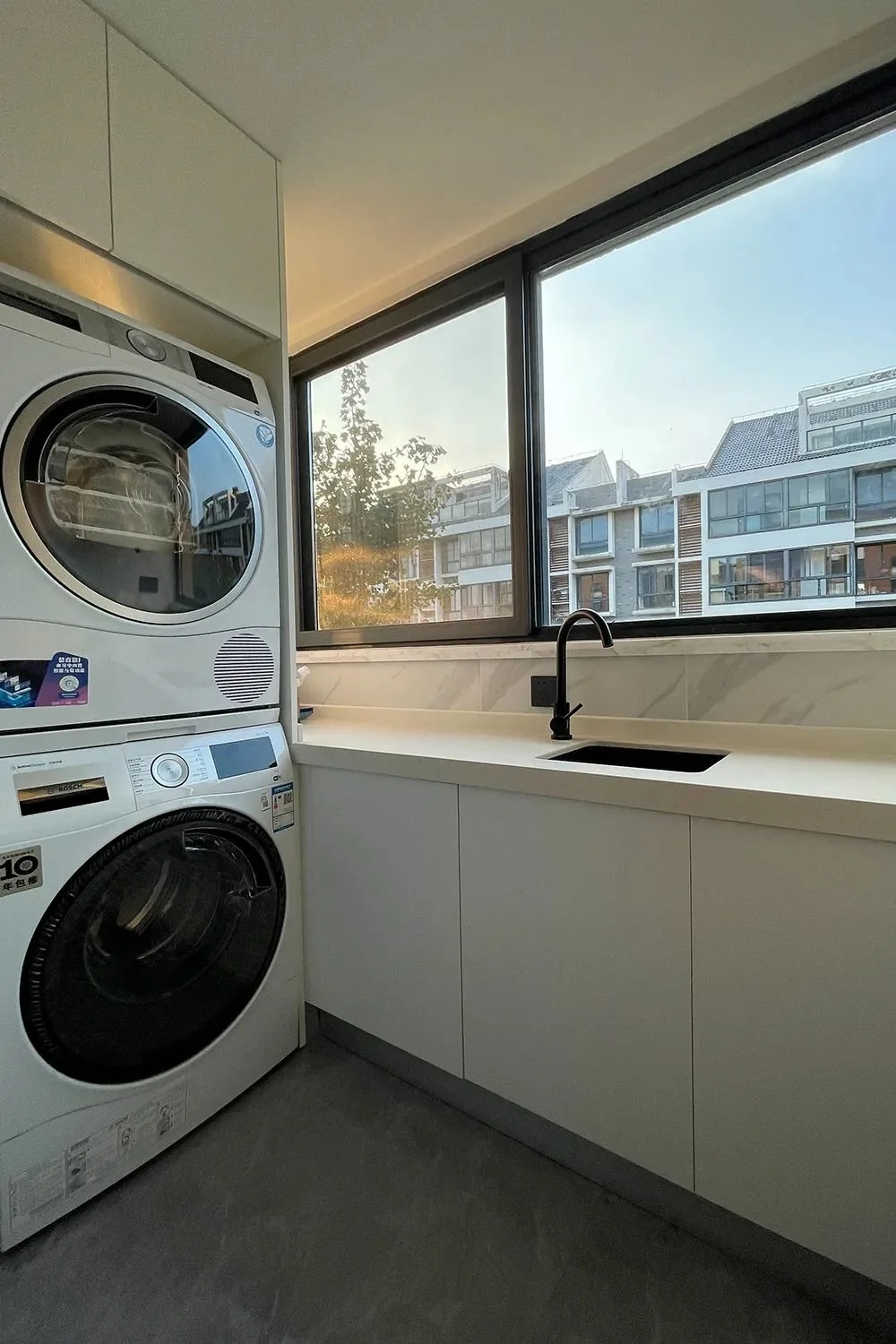 ▲因为客厅的阳台合并到客厅了,所以餐厅这边的阳台就成为了一个家政阳台,洗衣烘衣,清洁用品的收纳都能很好的解决。主卧