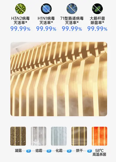 TCL小金聆智慧语音空调自带第五代58°C高温自清洁除菌黑科技,能够自内而外完成深层清洁内机经过58°C高温烘干杀菌,H3N2病毒灭活率、H1N1病毒灭活率、71型肠道病毒灭活率、大肠杆菌除菌率达99.99%。