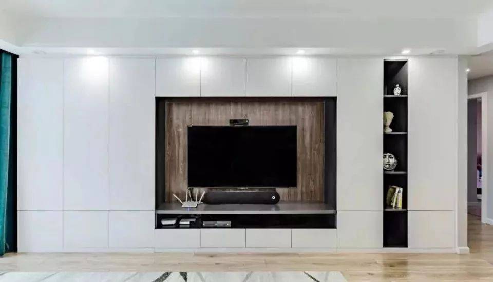 黑色皮质沙发搭配蓝色的抱枕,优雅又舒适,电视墙则设计成整面的收纳柜,为这个家增添了很多收纳空间。