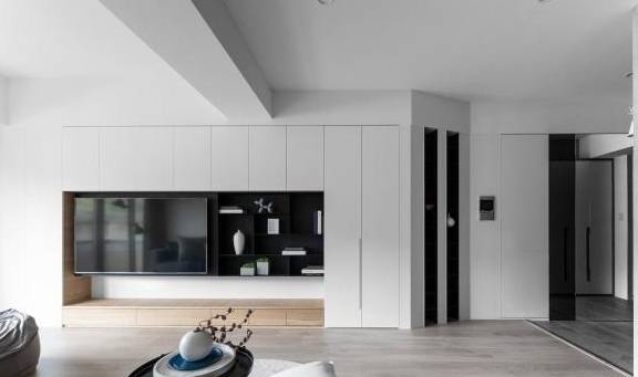 极简主义风格要尽量减少装饰,别做吊顶,脚踢线,多装灯,把不必要的隔断打通多用连贯的线条还有一点很关键:“家具要少而精,尽量定制大面积的整体家具”如果家里客厅面积还不算小,我们一般都会建议客户做这种顶天立地的功能性电视柜,一来增加家里储物空间,二来这种柜子具有墙面效果,柜子看起来很薄,空荡荡的客厅反而更显大。