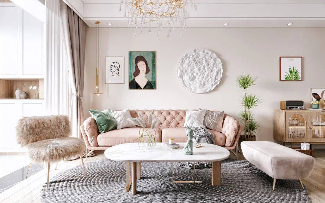 客厅以米色和原木色作主色调,营造出自然舒适的空间氛围。家具软装采用灰色和粉色设计,颜色搭配十分和谐。同时部分绿色作为空间色彩的点缀,为客厅注入一丝活泼的气息。厨 房