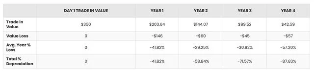 3000 元以下的手机,第一年直接贬值 42%,四年后只剩 12% 的残值,第二年贬值最低,价值还有接近一半,这时候换新是个明智的选择。