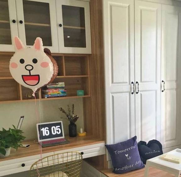卧室里没有飘窗,但空间又不够用来放大衣柜,可以利用窗户的位置人造一个飘窗。窗户两侧定制衣柜用来收纳,飘窗位置成为休息看书喝茶的小角落。11、一字板书桌