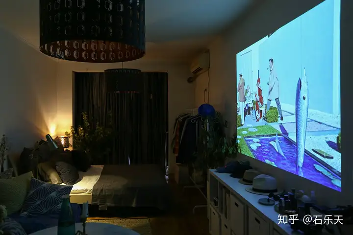图源:住范儿自摄或者在通顶柜子正前方,吊装一块可升降的幕布(注意幕布收起来后不能挡住柜子门),要看电视的时候,把幕布放下来,挡住柜子就好了。